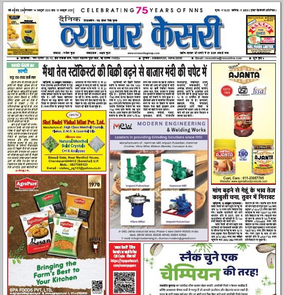 Vyapar Kesari is a dedicated hindi daily newspaper.It covers all agri-business news, provides accurate and regular commodity market updates, tips, market reports and commodity rates.