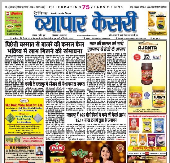 Vyapar Kesari is a dedicated hindi daily newspaper.It covers all agri-business news, provides accurate and regular commodity market updates, tips, market reports and commodity rates.