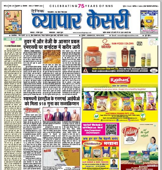 Vyapar Kesari is a dedicated hindi daily newspaper.It covers all agri-business news, provides accurate and regular commodity market updates, tips, market reports and commodity rates.