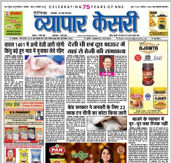 Vyapar Kesari is a dedicated hindi daily newspaper.It covers all agri-business news, provides accurate and regular commodity market updates, tips, market reports and commodity rates.